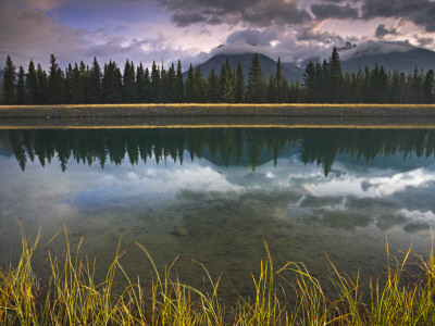 Adam Burton Art > Early Morning Sunlight Catches Grass Growing Beside Cascade River, Alberta, Canada Art Print