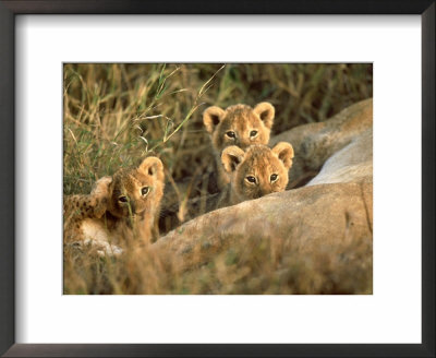 Adam Jones Art > Trio Of Six Week Old Lion Cubs Looking Over Sleeping Mother, Masai Mara National Reserve Kenya Art Print