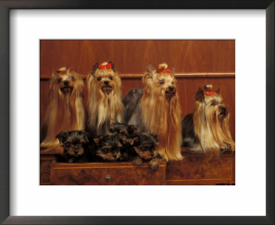 Adriano Bacchella Art > Domestic Dogs, Four Yorkshire Terriers With Four Puppies In A Drawer Art Print