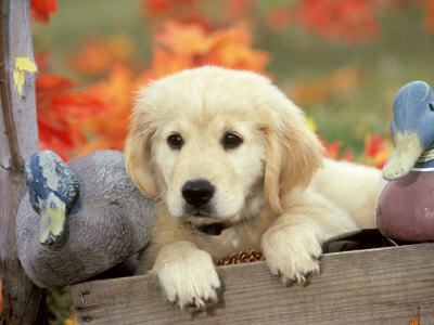 Alan And Sandy Carey Art > Golden Retriever, Puppy With Mallard Decoys In Autumn Art Print