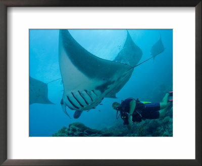 Amos Nachoum Art > Manta Rays With Diver, Yap Island, Caroline Islands, Micronesia Art Print