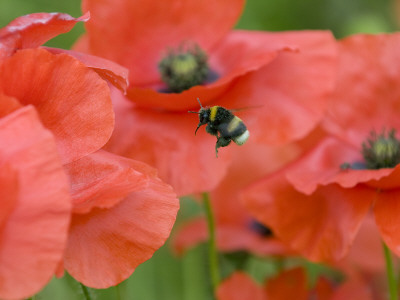 Andy Sands Art > Bumble Bee Flying To Poppy Flower To Gather Pollen, Hertfordshire, England, Uk Art Print