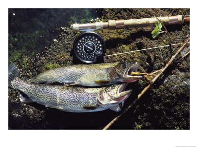 Bill Curtsinger Art > A Pair Of Cutthroat Trout, Salmo Clarki, And A Reel Lie On A Bank Art Print