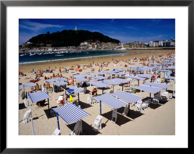 Dallas Stribley Art > Striped Sunshades At Playa De La Concha With Mt. Urgull In Background, San Sebastian, Spain Art Print