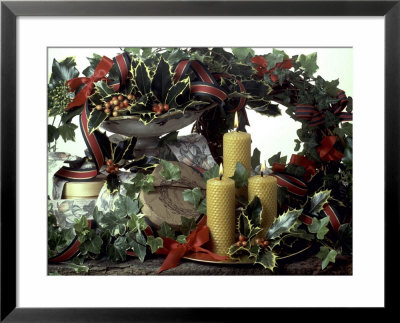 Erika Craddock Art > Christmas Arrangement With Holy And Ivy, Ribbons And Bees Wax Candles Art Print