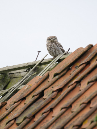 Gary Smith Art > Little Owl Perched On Derelict Barn Roof In Daylight, Norfolk, Uk Art Print