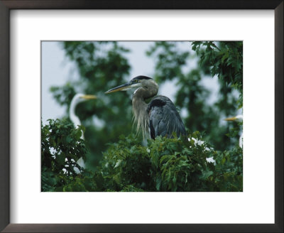 George Grall Art > A Great Blue Heron Sits In A Treetop Near A Flock Of Great Egrets Art Print
