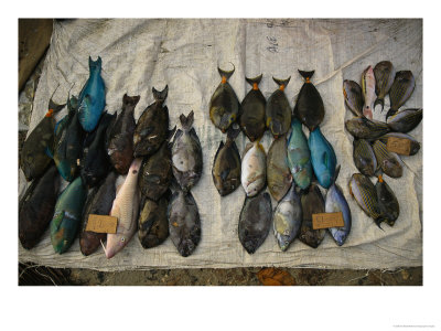 Ira Block Art > An Array Of Fish Are Spread Out For Sale On A White Cloth Art Print
