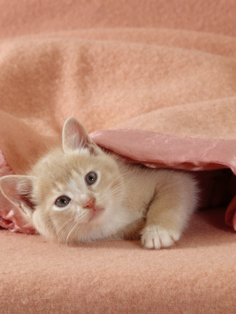 Jane Burton Art > Domestic Cat, Cream Kitten Emerging From Under A Pink Blanket, Bedroom Art Print