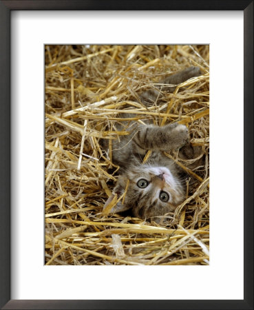 Jane Burton Art > Domestic Cat, Tabby Farm Kitten Playing In Straw Art Print