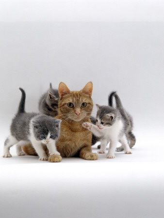 Jane Burton Art > Ginger Mother With 5-Week Persian X Burmese Kittens, Taken On After Her Own Kittens Were Weaned Art Print