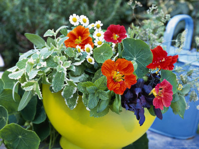 Linda Burgess Art > Summer Still Life, Yellow Bowl & Herb, Basil, Mint, Tropaeolum, Fennel, Sage, Feverfew Art Print