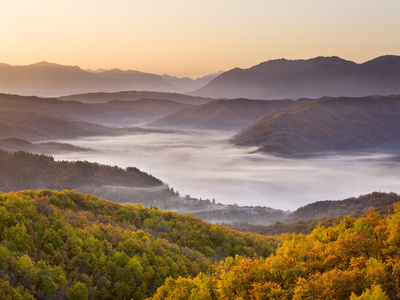 Lizzie Shepherd Art > Looking Down Onto The Little Zagorian Village Of Kipi On A Misty Morning In Autumn, Just After Sunr Art Print