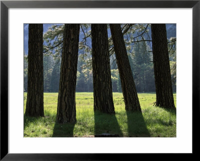 Marc Moritsch Art > Tall Evergreen Tree Trunks In A Meadow At The Base Of A Mountain Art Print