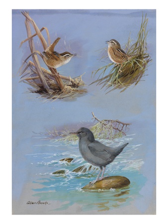 National Geographic Society Art > A Painting Of An American Dipper, A Marsh Wren, And A Sedge Wren. Art Print