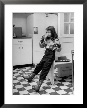 Nina Leen Art > Young Girl Wearing Cowgirl Outfit Drinking Milk And Eating Sandwich In Kitchen Art Print