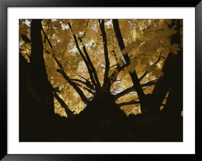 Stephen St. John Art > View Looking Up An Oak Tree Trunk At Highlighted Yellow Autumn Leaves Art Print