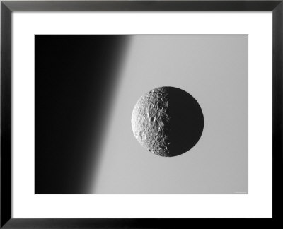 Stocktrek Images Art > This Amazing Perspective View Captures Battered Moon Mimas Against The Hazy Limb Of Planet Saturn Art Print
